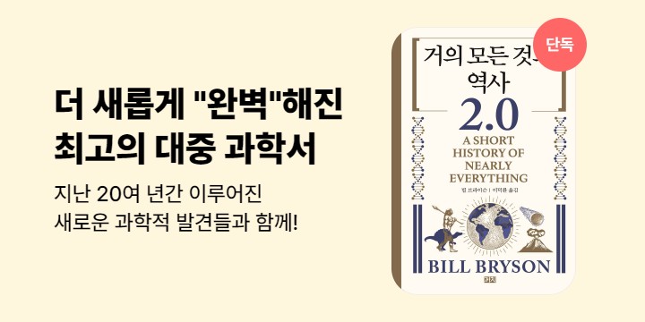 21세기 최고의 자연과학 분야 베스트셀러 최신 과학으로 무장한 거의 모든 것에 대한 거의 완벽해진 역사 지식과 재미, 유머까지 겸비한 최고의 스토리텔러, 빌 브라이슨이 돌아왔다! 2003년 출간 이래, 전 세계 수많은 독자들의 변함없는 지지와 사랑을 받아온 빌 브라이슨의 『거의 모든 것의 역사』가 20년 만에 최신의 과학적 성과를 빠짐없이 보강하여 새...