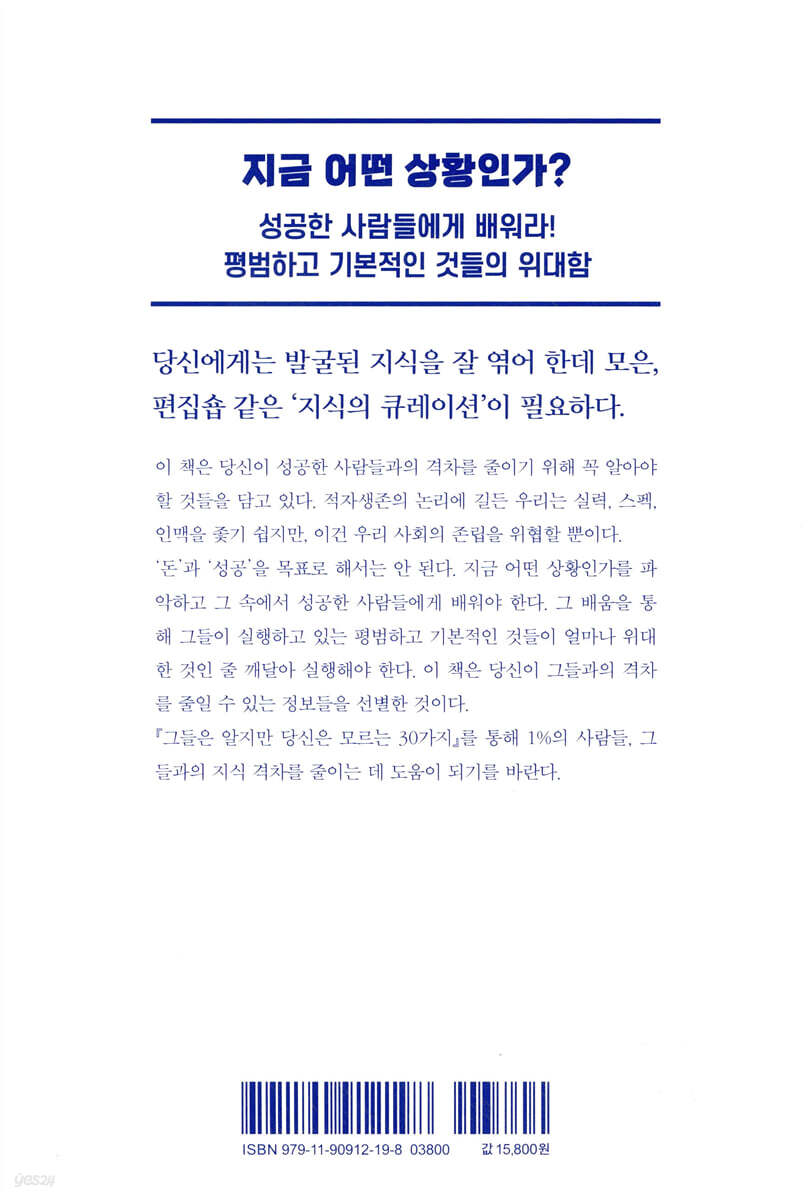 몰입이 중요하다고 한다. 어디에 집중할 것인지를 정확히 알고 있다면 말이다. 우리가 가진 문제는 눈에 띄는 모든 것에 조금씩 몰입한다는 사실이다. 내 시간을 나를 위한 시간으로 쓰지 못하고 있다는 문제를 안고 있다. 이 책 <그들은 알지만 당신은 모르는 30가지>에는 우리가 가진 이런 문제들을 짚어내고 해결책을 제시한 책들의 핵심을 요약 정리했다. 내가 가진 문제점을 일깨운다는 점, 그리고 해결할 방법을 간단하나마 요약해서 보여준다는 점이 장점인 책이다. 잊고 있던 책을 다시 꺼내 본다. 알지만 활용 못했던 것들을 발견한다.