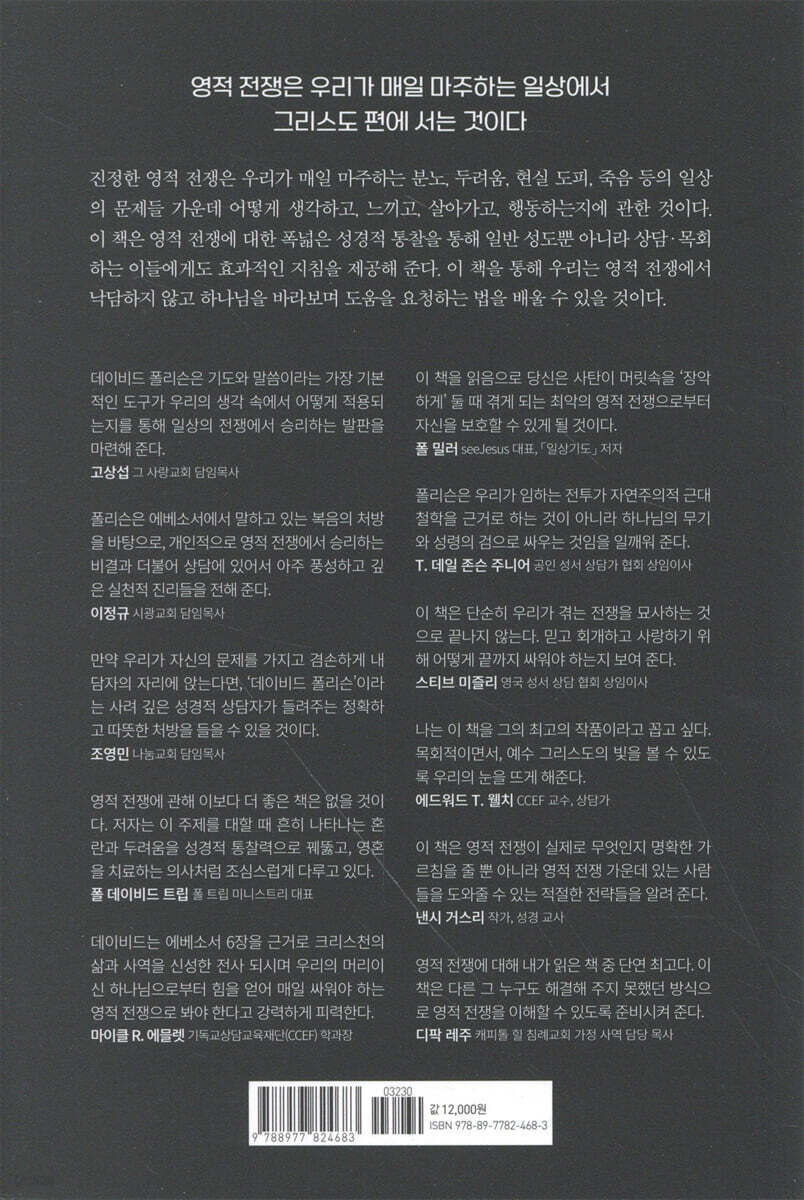 모든 그리스도인은 영적인 전쟁터 한가운데에 서 있지만, (『나를 포함해) 많은 그리스도인들이 전쟁터 한가운데에서 한가롭게 음악을 들으며 유유자적하다가 사탄과 죄에 의해 노략질당하는 일이 많은 것 같다. 아마 이 책의 서론 부분에 나오는 폴리슨의 개인적 경험 이야기만 들어도 우리가 늘 사탄의 이간질 가운데 있음을 알 수 있을 것이다. 폴리슨은 에베소서에서 말하고 있는 복음의 처방을 바탕으로, 개인적으로 영적 전쟁에서 승리하는 비결과 더불어 상담에 있어서 아주 풍성하고 깊은 실천적 진리들을 전해 준다. 성화의 길을 걸어가는 그리스도인들에게도 꼭 필요한 책이지만, 영적 전쟁의 개념에 대해 모호하게 생각하는 나 같은 목회자들에게도 꼭 필요한 책이다!
