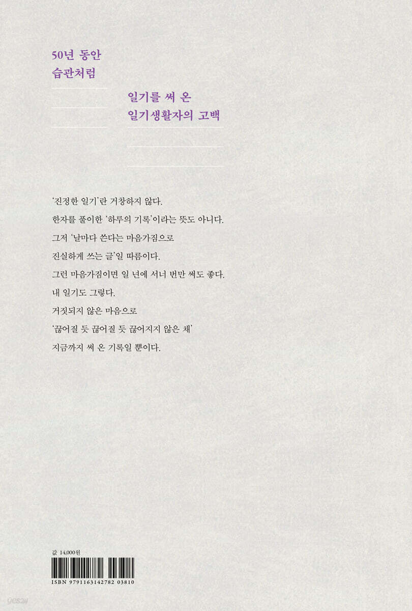 스스로를 ‘일기 쓰는 인류이며, 일기 중독자’로 소개하는 저자는 13살부터 50년 동안 일기를 썼다고 한다. 하루도 빠지지 않고 일기를 쓴 것은 아니지만, 저자가 그동안 썼던 일기가 권수로만 150권을 넘겼다고 하니 대단하다고 생각하지 않을 수 없다. 저자는 자신이 쓴 일기를 기반으로, 이 책을 펴냈다고 한다. 물론 책의 내용은 일기 쓰기를 권장하거나 방법을 제시하는 것이 아니라, 저자에게 일기 혹은 일기 쓰기란 어떤 의미인가를 조근조근하게 설명하는 내용에 초점이 맞춰져 있다. 간혹 자신의 과거 일기를 읽으면서, 그 시절을 회상하기도 했음을 밝히고 있다. 다른 이들에게는 그저 흥밋거리로 여겨질 수도 있지만, 일기란 당사자에게는 자신의 삶의 역정이 고스란히 기록된 역사라고 할 수 있을 것이다.