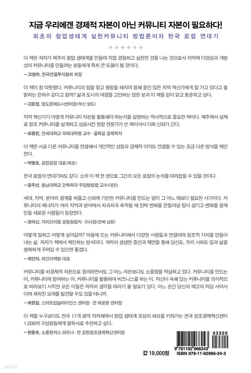 우리 사회는 혈연, 지연, 학연, 진영 중심의 사회로 커뮤니티 간의 단절과 반목이 크며 많은 문제를 낳고 있다. 이러한 커뮤니티 문제를 해결하는 것이 지속가능한 사회로 나갈 수 있는 길이라고 믿는다. 내가 2008년에 고벤처포럼을 만들어 다양한 사람들이 서로 연결되어 지식과 경험을 나누는 개방적인 스타트업 커뮤니티와 생태계를 만들고자 했던 이유다. 이 책은 저자가 제주의 창업 생태계를 만들며 직접 경험하고 실천한 것을 나눈 것으로서 지역에 다양성과 개방성의 커뮤니티를 만들려는 분들에게 특히 큰 도움이 될 것이다.