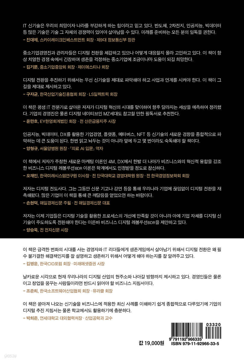 저자는 삼성, CJ, SPC 등에서 다년간 임원과 대표이사를 역임한 IT 전문가이며 국내 유수 신문이 선호하는 칼럼니스트이기도 하다. 바쁜 직장생활 중에도 기술사와 박사학위를 취득한, 실무와 이론 모두를 겸비한 보기 드문 사계의 권위자이다. 이 책에서 저자가 주창한 새로운 마케팅 이론인 4M과 디지털 전환DX에서 한발 더 나아가 비즈니스와의 혁신적 융합을 강조한 비즈니스 디지털 레볼루션BDR 이론은 학계에서도 인정받을 정도로 참신하다. 사례도 정갈하고 설득력이 있어서 디지털 전환 추진 리더뿐 아니라 일반 독자에게도 필독을 권한다.