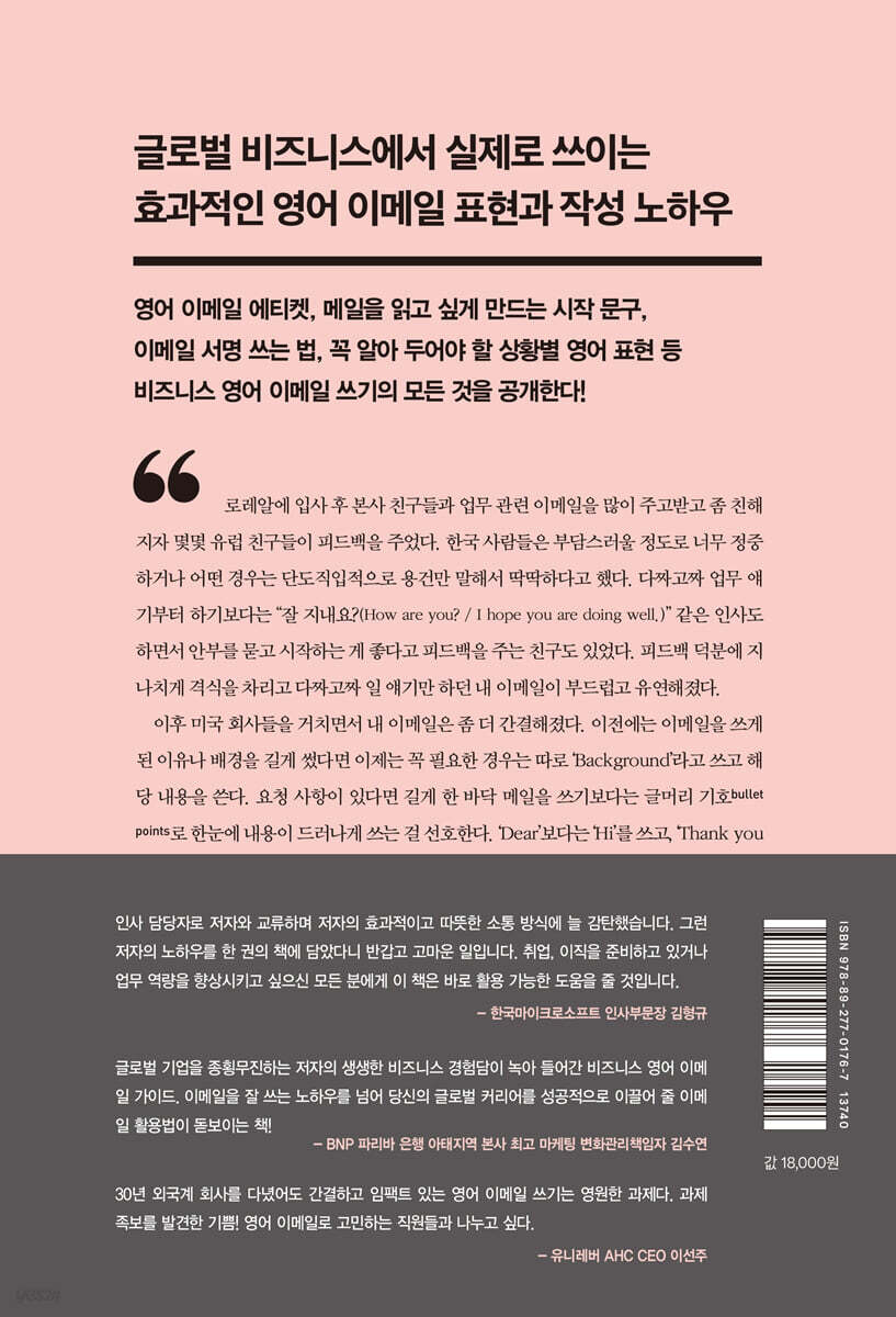 난 이 책을 예의바른 영어 비즈니스 이메일 표현 도서라 느꼈다. 표현 하나하나 신경써야 하고 말 한 마디 할 때마다 이 말을 써도 되는건지 조심해야 하고, 좋게 말하는 습관을 가져야만 업무를 할 때 수월하게 할 수 있는 효과를 보충할 수 있을 거 같아서 이 책이 확실히 피드백으로 잘 만들어진 도서라고 느껴지게 되었다.
