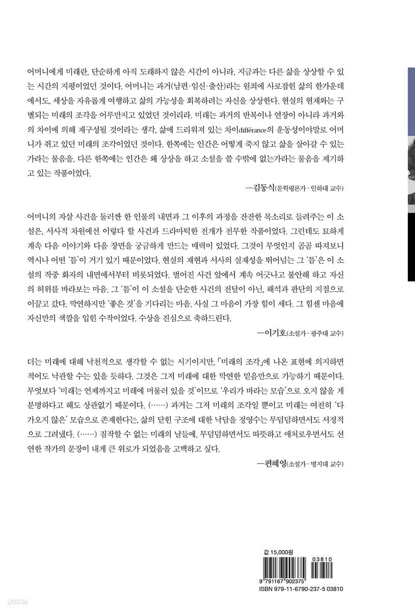 대상 수상작인 정영수 작가의 「미래의 조각」은 어머니의 자살 시도를 계기로 그 곁을 지키는 소설가인 둘째 아들의 시선으로 바라본 어머니의 인생과 가슴에 간직한 마음을 그려가고 있다.