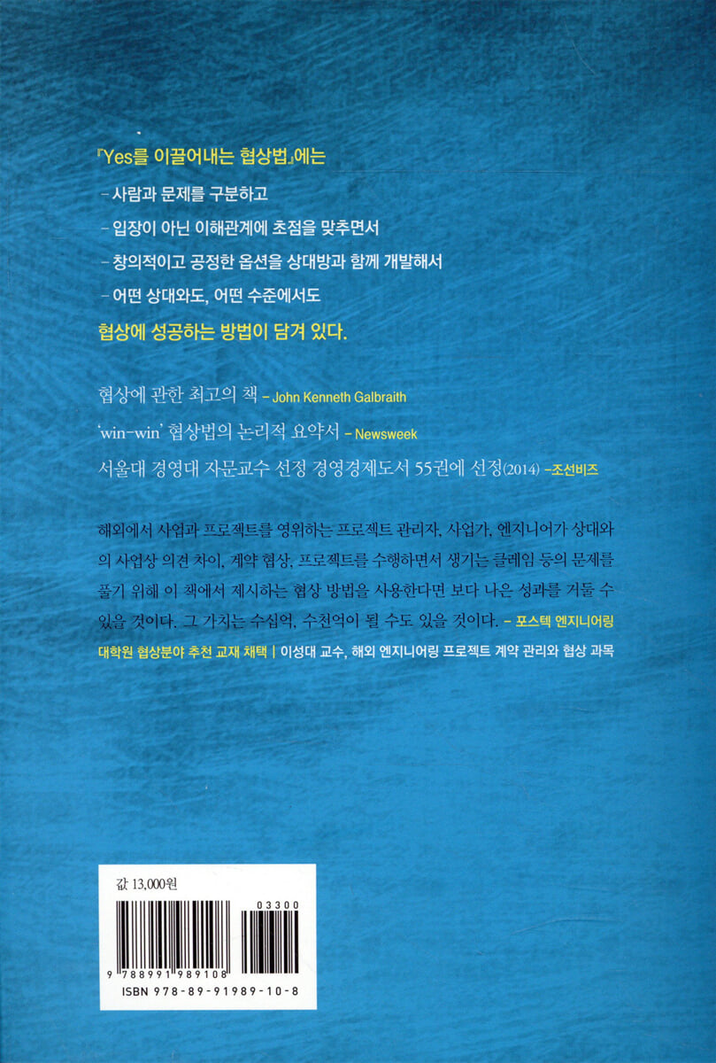 사실 내게 이 책은 번역본 재개정판이 막 출간될 즈음 학교 Negotaiation 강의 교재였던 책이다. 더 정확히 말하면 이 책의 원서인 'Getting to Yes'가 부교재 였지만, 읽는 속도가 붙지 않아 번역본이 출간된 것을 확인하고, 구입 후 발췌독 형식으로 참고 했던게 전부였다. 당시 강의의 80% 이상을 그룹을 지어 동일한 사안을 두고 상반된 스토리를 협상 양측에 봉인된 채 제시하고 그것을 숙지하고 실제 협상하는 방식으로 진행이 되었었는데, 개인적으로는 스토리 속 상황 자체를 이해하지 못해(더 정확히는 너무 황당해서 받아들이지 못해) 완전한 그 입장이 되지 못해서 상당히 애를 먹었던 기억이 있다. 이번에 이 책을 다시 읽으며 만약에 그 때 이 책을 꼼꼼하게 읽었다면 그 상황들을 있는 그대로 받아들이고 협상에 임할 수 있었을까를 수도 없이 생각하며 읽었다. 사실 다시 그 상황으로 돌아가도 쉽지는 않을 것 같다는 결론이 나왔지만 말이다.