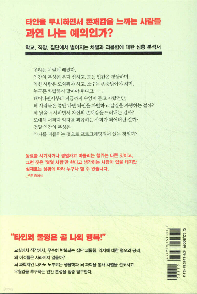 저자에 의하면 "집단 괴롭힘과 같은 사회적 배제 행위가 인간이 종(種)으로서 존속하는 데 유리한 방법이었다"고 한다. 자연계에서 약자인 인간의 무기는 '집단'이었으며 집단을 이루어 '고도로 발달한 사회성'을 지니게 되어 지금까지 생존할 수 있었다고 한다. 집단 괴롭힘은 사회를 위해 공헌하거나 타인을 도우려는 '향사회성'의 발달로 나타나는 제재 행동인 '생크션(sanction)'이라 한다.