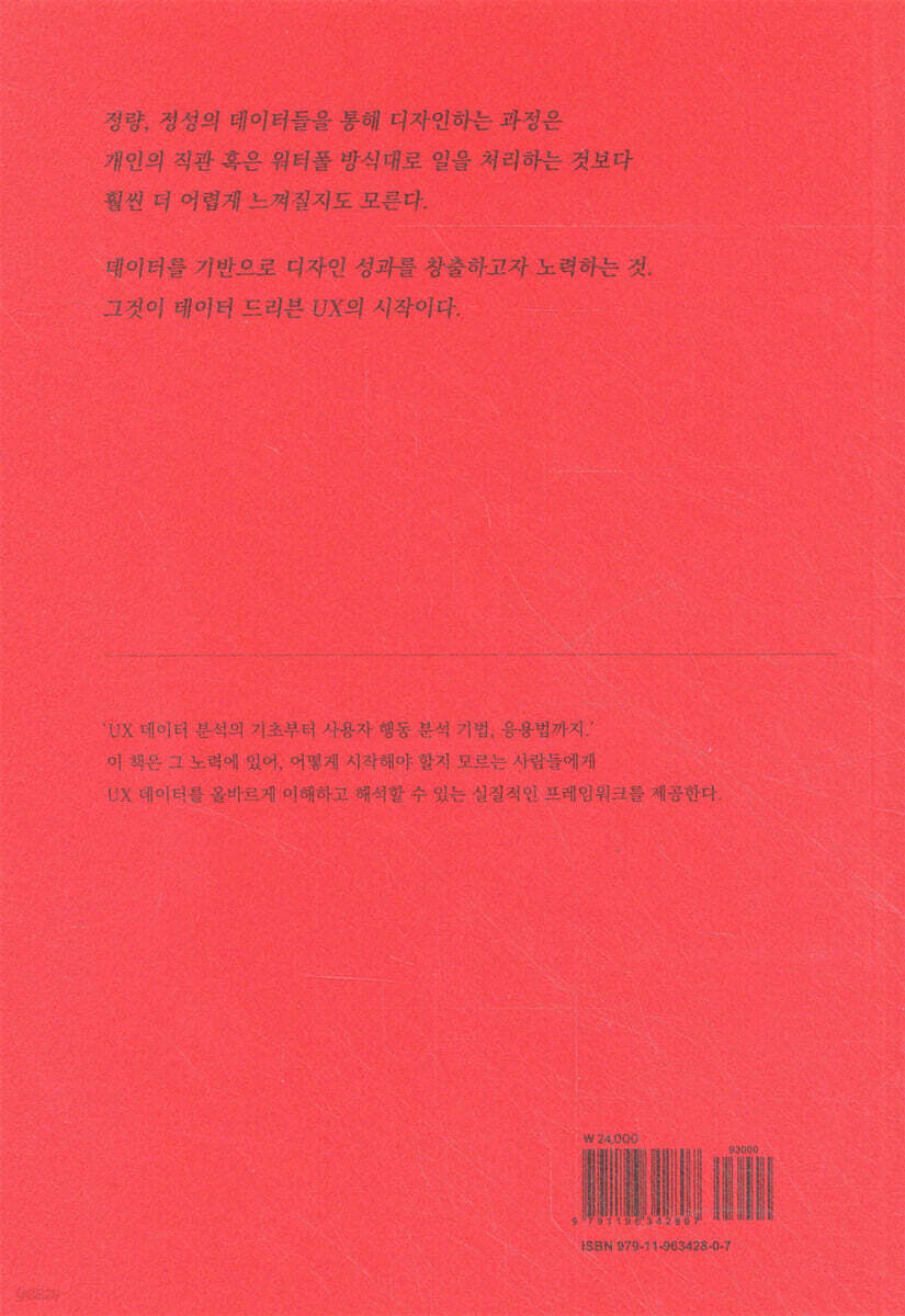 『Data-Driven UX : 데이터가 두려운 실무자를 위한 입문서』는 데이터를 인터넷 비즈니스에 활용하고자 하는 기업에 기본 가이드이자 매뉴얼 역할을 하는 책이 되리라 생각합니다. 이 책은 데이터의 기본 개념과 함께 데이터를 활용하는 기업과 UX를 공부하는 학생들을 위한 기초적인 내용부터 차근히 설명하고 있습니다. 또한 데이터 분석에 아직 익숙하지 않은 독자를 위해 분석 프로세스와 목표 설정 단계를 설명하고 있어 데이터 분석은 물론 시도하고 UX 디자인 개선과 혁신 활동에 바로 사용할 수 있는 가이드가 될 것입니다.