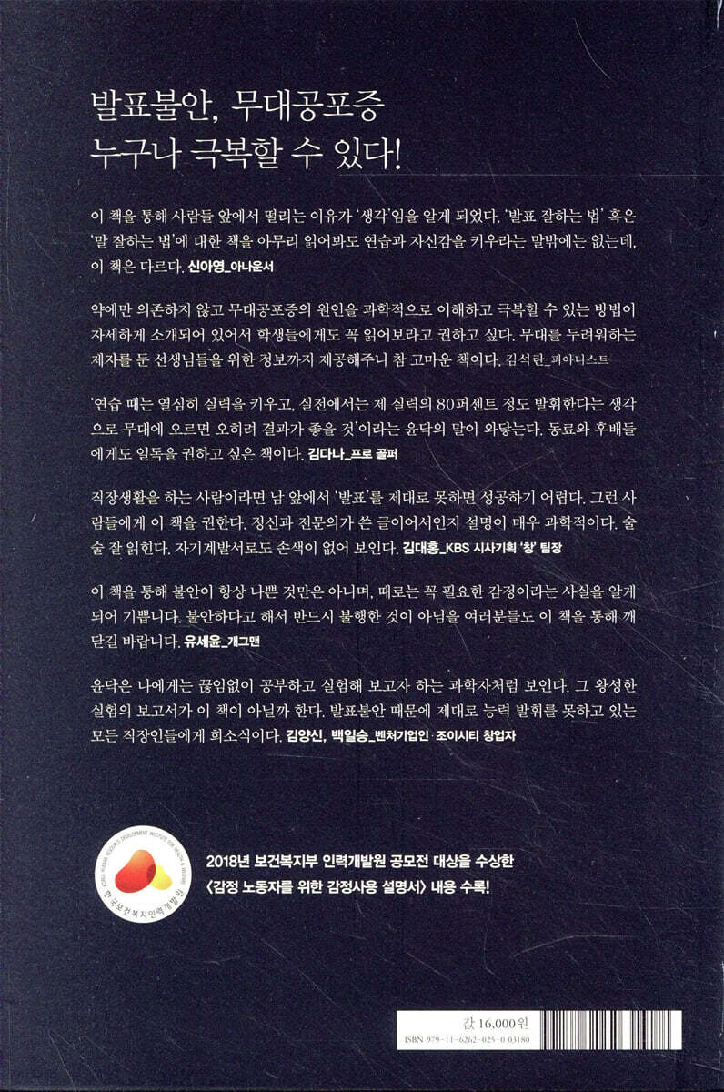 근래에 인지과학의 발달이 IT 분야의 인공지능 개발에 큰 성과를 거두면서, 심리학에서도 정신과 치료에서도 인지행동치료가 도입되었다. 어느 분야에서나 최신의 개척 분야이다. 윤닥은 나에게는 새로운 것에 대한 학자적인 호기심을 가지고 끊임없이 공부하고 실험해 보고자 하는 과학자처럼 보인다. 그 왕성한 실험의 보고서가 이 책이 아닐까 한다. 타고난 무대공포증도 이제는 훈련에 의해서 고쳐지는 모양이다. 발표불안 때문에 제대로 능력 발휘를 못하고 있는 모든 직장인들에게 희소식이다.
