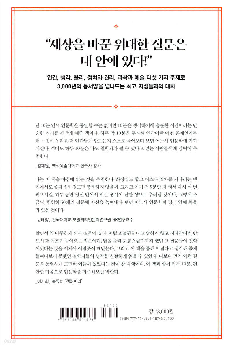 이렇게 계속 생각의 꼬리에 꼬리를 물다보면, 인문학에 대해 가까워지기는커녕 인문학이 심오하고 어려운 것으로 여겨져 끝내 눈에 보이지 않는 벽에 부딪히는 듯한 느낌을 종종 받게 된다. 그러던 중 책제목부터 부담없이 가벼운 마음으로 인문학을 접할 수 있게 만들어줄 것 같은 책을 만났다. 바로 <하루 10분 인문학>이라는 책이다. 책표지에서 적혀있는 "하루 한 줄, 인문학에게 나를 묻는다!"라는 이 한 줄은 지금껏 내가 생각해온 인문학의 의미를 다시금 묻게 만들었다. 일생 동안 스스로에게 던진 수많은 질문과 그에 답하는 순간만큼은 나도 철학자가 되는 것이라는 저자들의 메시지는 나에게 응원가처럼 들리기도 했다.