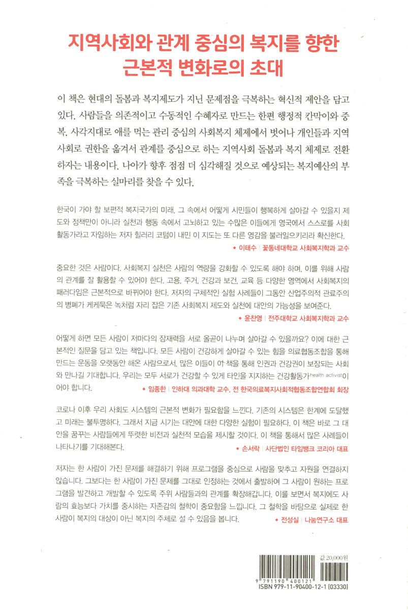 “이 책은 영국의 복지제도를 다시 돌아보는, 기본적으로 영국에 대한 이야기이다. 하지만 우리가 던지는 질문과 발견점들에 대해 많은 사람들이 공감하리라 생각한다.” 저자가 언급한대로 우리나라 역시 이 책에서 묘사하는 영국의 상황과 크게 다르지는 않을 것이다. 우리나라 역시 비효율적이고 경직된 서비스 전달 체계, 사회복지시스템에서 소외받는 사회적 약자들, 만족할 만한 수준에 미달하는 서비스 질, 부족한 복지 재정 등의 문제를 갖고 있고, 저출산과 고령화로 인해 미래 재정 확보에 차질이 예상되어 상황은 더욱 악화될 것으로 예상할 수 있다. 따라서 우리나라 역시 영국의 사례를 타산지석으로 삼아 같은 전철을 밟는 것을 피할 수 있을 것이다.
