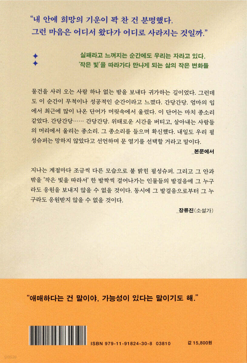 큰 마트가 생기며 슈퍼는 점점 전기를 줄여가고 빛은 점점 작아지지만, 빛의 크기와 따뜻함은 정비례하지 않는구나를 생각하게 된다. 어디선가 아직도 살고 있을 것 같은 동년배의 주인공이 지금은 대학로에서든, TV에서든 첫 뺑덕어멈 역할의 희열을 마음껏 느끼며 살고 있기를 바라는 응원하는 마음까지 갖게 되며 그냥 “열심히, 하루하루 살아가자” 라는 다짐까지 하게 되는 예쁘고 따뜻하고 이상한 책이었다.