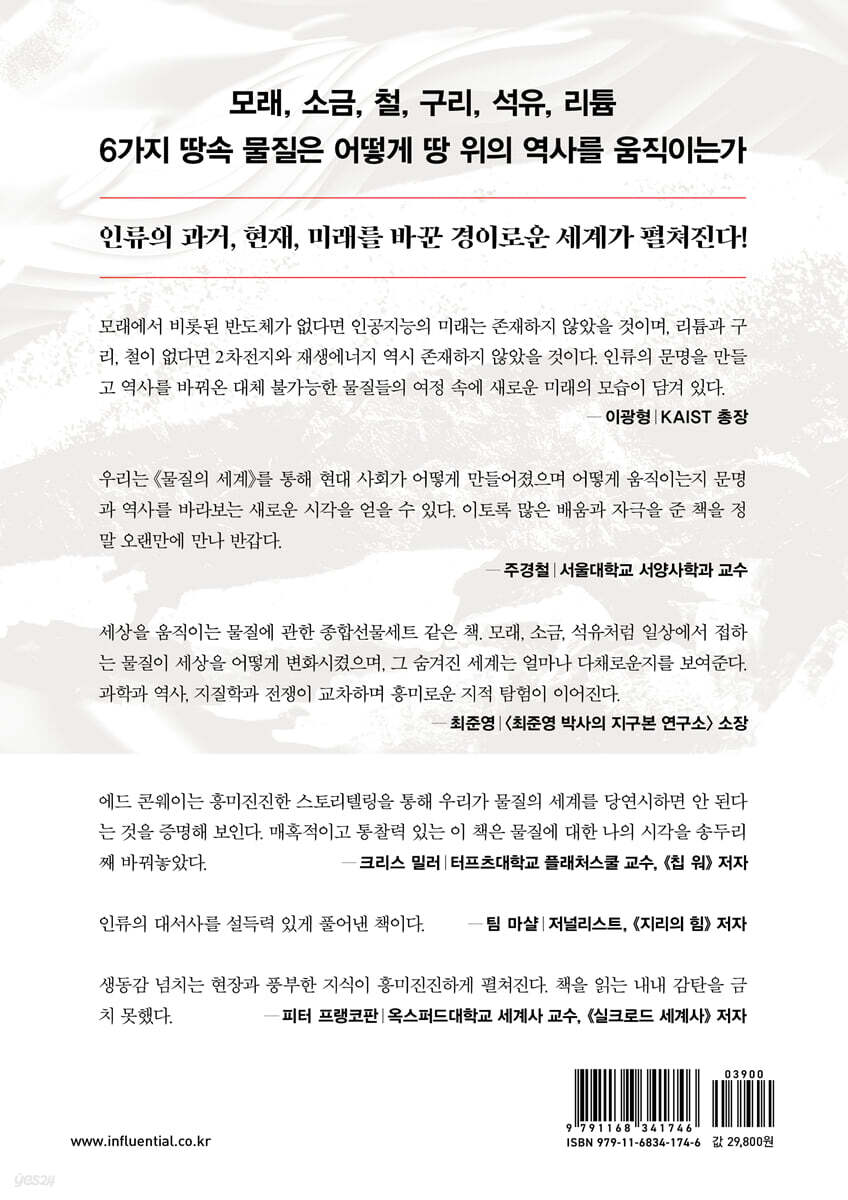 에드 콘웨이가 가장 중요한 물질로 꼽은 여섯 가지는 모래, 소금, 철, 구리, 석유, 리튬이다. 이 가운데는 모래나 소금과 같은 태곳적부터 인류에게 필수불가결하다고 여겨져 온 것이 있는가 하면, 철과 구리처럼 인류 문명을 가르는 중요한 재료로 삼는 것도 있다. 그리고 현대 문명을 일구는 데 결정적인 역할을 했으며 지금도 중요한 분쟁의 원인이 되기도 하는 석유가 있고, 21세기에 들어서야 그 중요성이 극대화된 리튬이 있다. 그런데 이렇게 구분했지만, 모래나 소금도 현대에 정말로 중요한 물질이며, 그 중요성이 하나도 감소하지 않았다. 다시 말하지만 우리는 그것을 인식하지 못할 뿐이다.