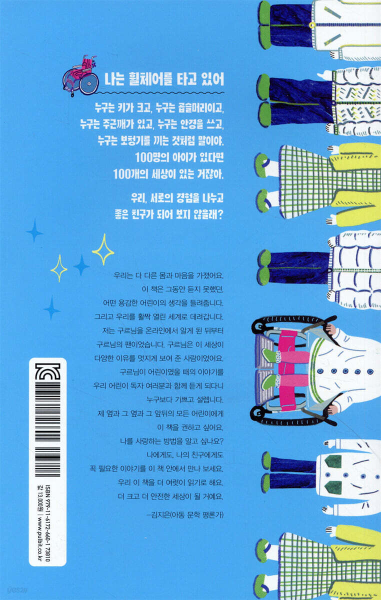 우리는 다 다른 몸과 마음을 가졌어요. 이 책은 그동안 듣지 못 했던, 어떤 용감한 어린이의 생각을 들려줍니다. 그리고 우리를 활짝 열린 세계로 데려갑니다.