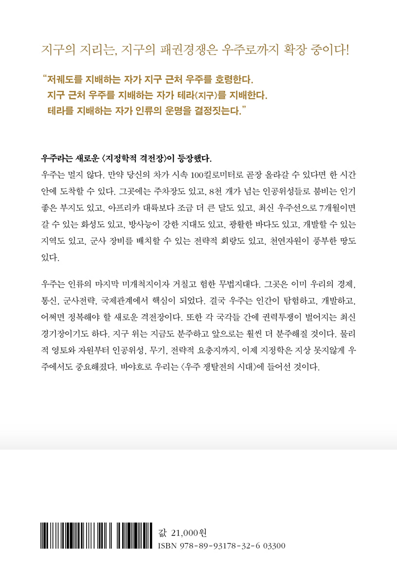 팀 마샬의 베스트셀러 '지리의 힘' 시리즈의 세 번째 책인 《지리의 힘 3: 우주라는 새로운 전쟁터》는 인류의 시선을 지구 너머 우주로 확장하며, '천체정치학(Astropolitics)'이라는 새로운 지정학적 현실을 심층적으로 분석한다. 저자는 고대부터 이어져 온 인류와 하늘의 관계를 되짚으며, 냉전 시대의 미·소 경쟁이 어떻게 우주 개발을 가속화시켰는지 역사적 맥락을 짚어준다.