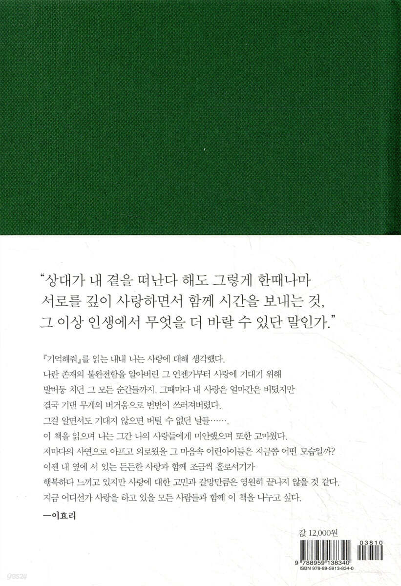 지금 나에게 무엇보다도 필요한 것은 상처 받는 것을 두려워하지 않고 기꺼이 그것을 받아내며 나 스스로 성장해가는 시간이라는 생각이 든다. 몇 달 남지 않은 올해가 가기전에 나역시 기꺼이 상처를 받으며 해인이 그랬듯 내 안에 어린아이를 이제 그만 감정에 솔직하고 상처를 두려워하지 않는 어른으로 성장시켜 나가야겠다.