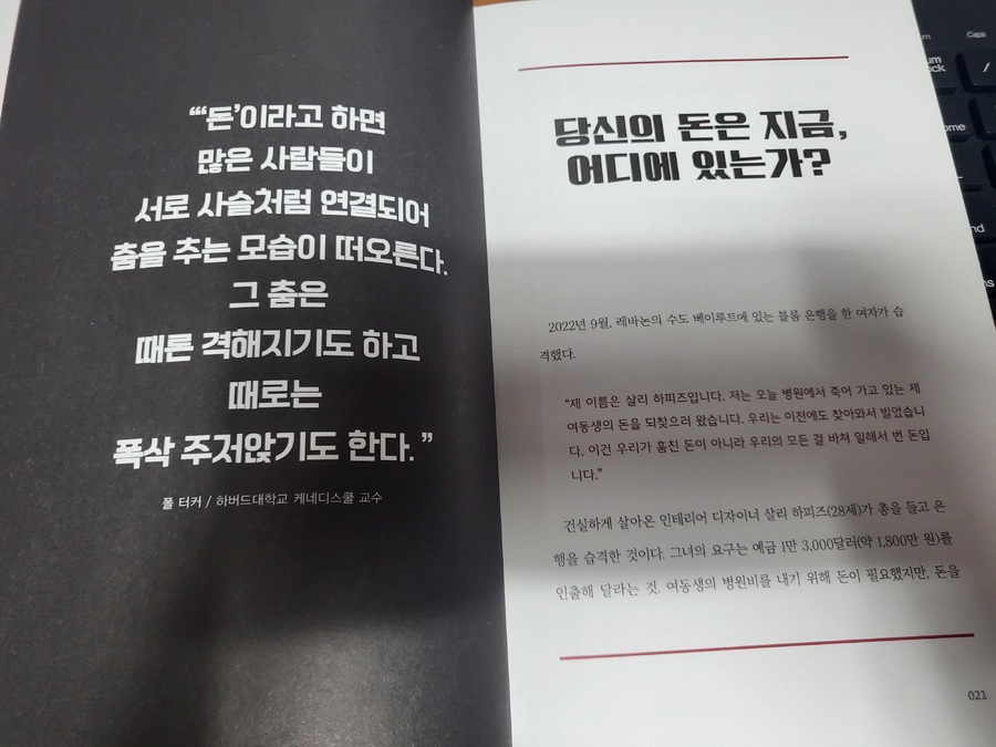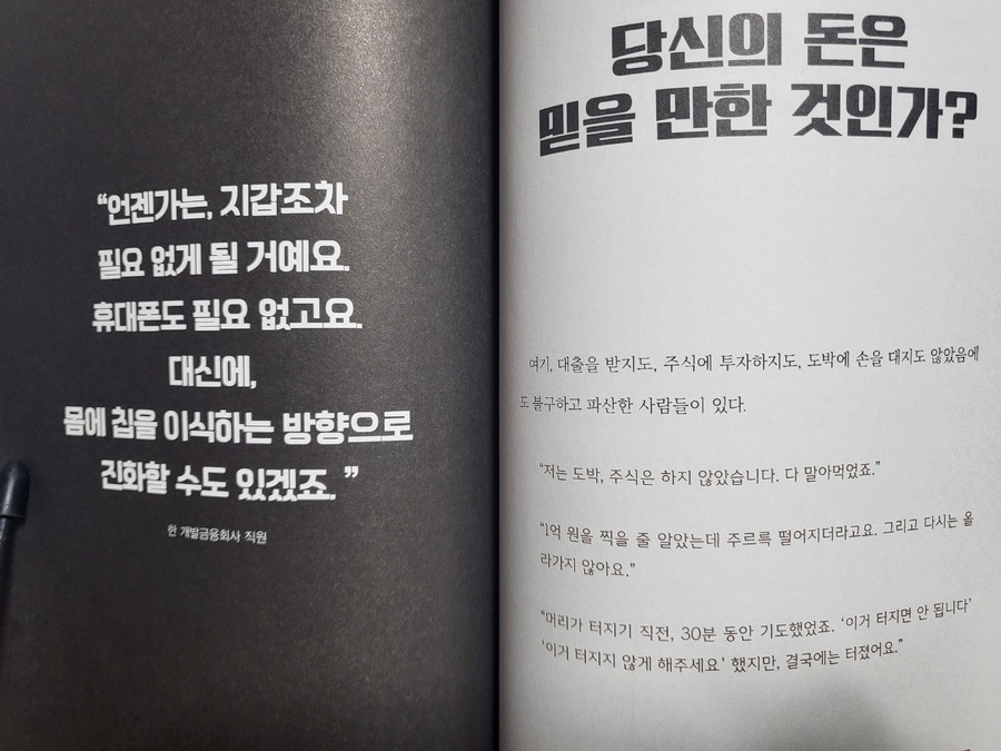 나를 포함한 무지한 사람들은 돈에 대해, 그리고 빚에 대해 너무도 순진하게 생각해 왔다. '빚지지 말아야 한다'는 이야기를 귀에 못이 박히게 들어왔지만 아이러니하게도 우리가 살아가는 사회는 빚이 있어야만 굴러갈 수 있다. 자본주의에서 돈이 있는 사람들은 이 '빚'때문에 더 많은 돈을 벌고, 돈이 없는 사람들은 바로 이것 때문에 파멸에 이른다.
