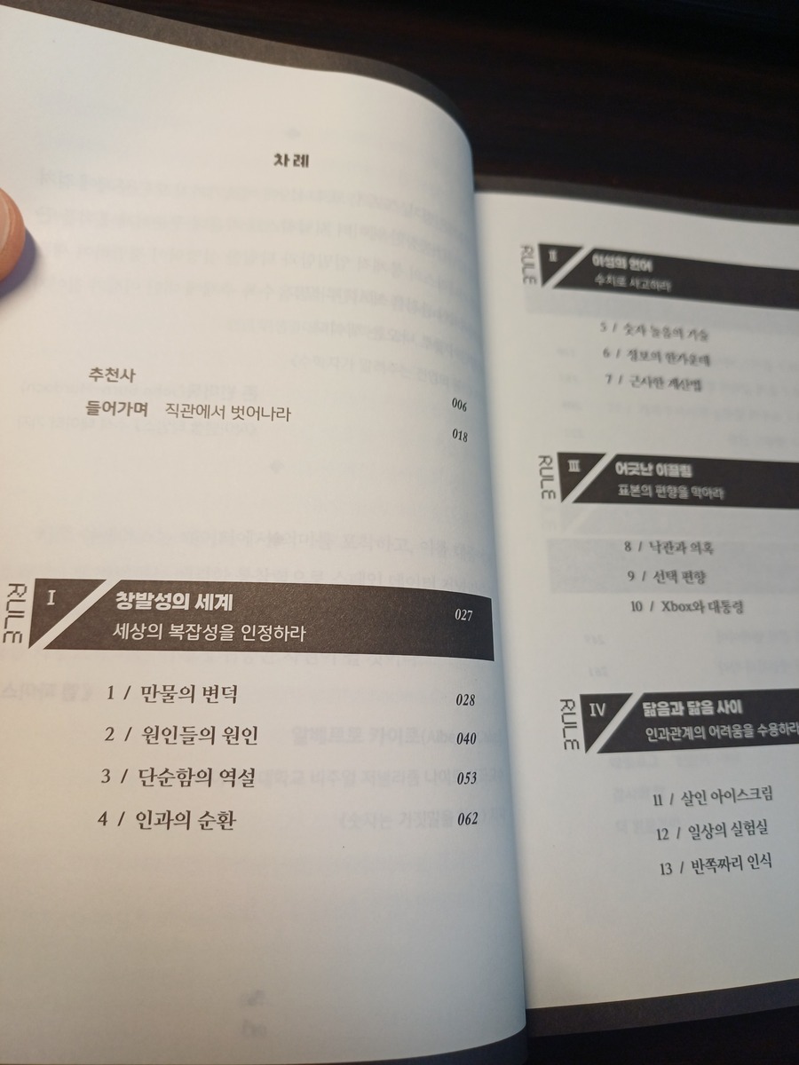 이 책의 큰 구조는 '세상은 생각보다 훨씬 복잡하다'는 전제를 받아들이는 것에서 출발해, 그 복잡성을 다루는 8가지 규칙으로 이어진다. 목차를 보면 1부에서 우연·변덕, 인과의 착시와 같은 주제를 다루고, 이어지는 규칙에서는 숫자로 사고하는 법, 샘플과 표본을 보는 법, 인과와 상관을 구분하는 시각을 훈련시키는 식으로 전개된다.
