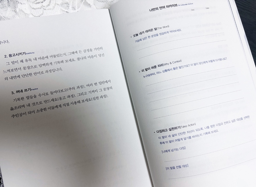 또한, 부록으로 수록된 '100일 언어 아카이브'는 이 책을 완성하는 보물 같습니다. 매일 하루를 돌아보며 내 마음에 머문 말을 '응고'시키고, 내일의 '나침반'으로 삼는 과정 자체가 커다란 심리 치료였습니다. 책을 덮고 나니, 이제야 비로소 제가 제 삶의 주도권을 쥔 기분입니다.