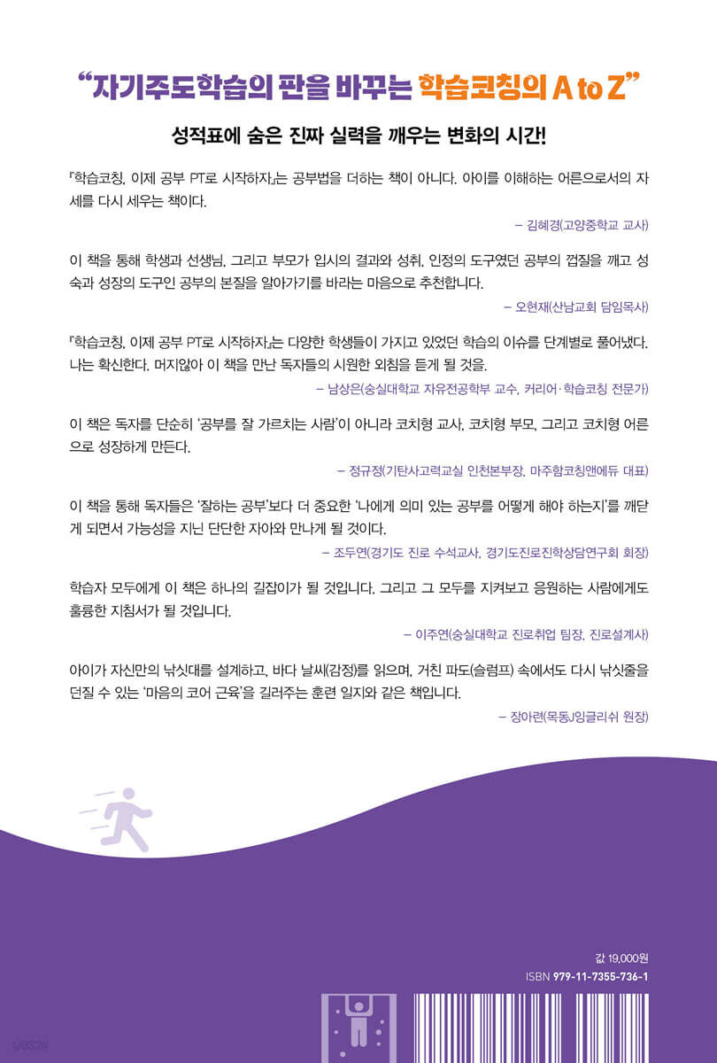 이 책은 독자를 단순히 ‘공부를 잘 가르치는 사람’이 아니라 코치형 교사, 코치형 부모, 그리고 코치형 어른으로 성장하게 만든다. 저자는 이 책을 통해 지금까지 우리가 거의 접해보지 못했던 ‘코치로서의 학습 접근’을 매우 구체적이고 실천할 수 있는 방식으로 제시한다. 나는 이 책을 이제 막 학습의 출발선에 선 아이를 둔 부모, 학생을 가르치는 모든 강사와 교사라면 반드시 한 번은 읽어보아야 할 필독서라고 생각한다.