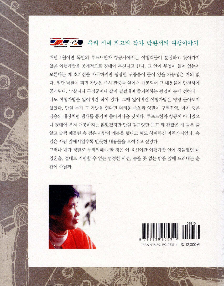 책의 제목이 되는 <잃어버린 여행가방>은 어느 나라에서는 '잃어버린 여행가방'을 경매에 부친다는 것이다. 그 가방에는 별거 별거 다 들어 있겠지만 여행가방에는 다른 무엇보다 여행하며 입었던 꼬질꼬질한 것들이,삶의 애환이 가득 담긴 것들이 냄새를 폴폴 풍기며 들어 있을 것이다.작가 또한 자신의 여행가방을 딱 한번 잃어버렸던,자의가 아닌 타의에 의해 잃어버렸지만 그 가방에 들어 있던 그동안 자신을 감싸고 있던 '애환' 에 대한 것을 토로한다. 여행가방에 귀중품을 싸가지고 나오는 사람은 없을 것이다.나 또한 여행가방을 싸면서 느끼는 설레임과 가방안에는 온통 여행지에서 필요한 것들 ,옷가지나 생필품을 챙기게 되는데 돌아 오는 길에는 가방안에서 나는 케케한 냄새,그것이 삶이고 여행이리라. 떠 날 때는 설레임으로 가득했던 여행가방이 돌아오는 길에는 낯 익는 냄새로 가득하고 다시금 익숙한 삶으로의 회귀의 시간을 가지는 것이 아닐까.