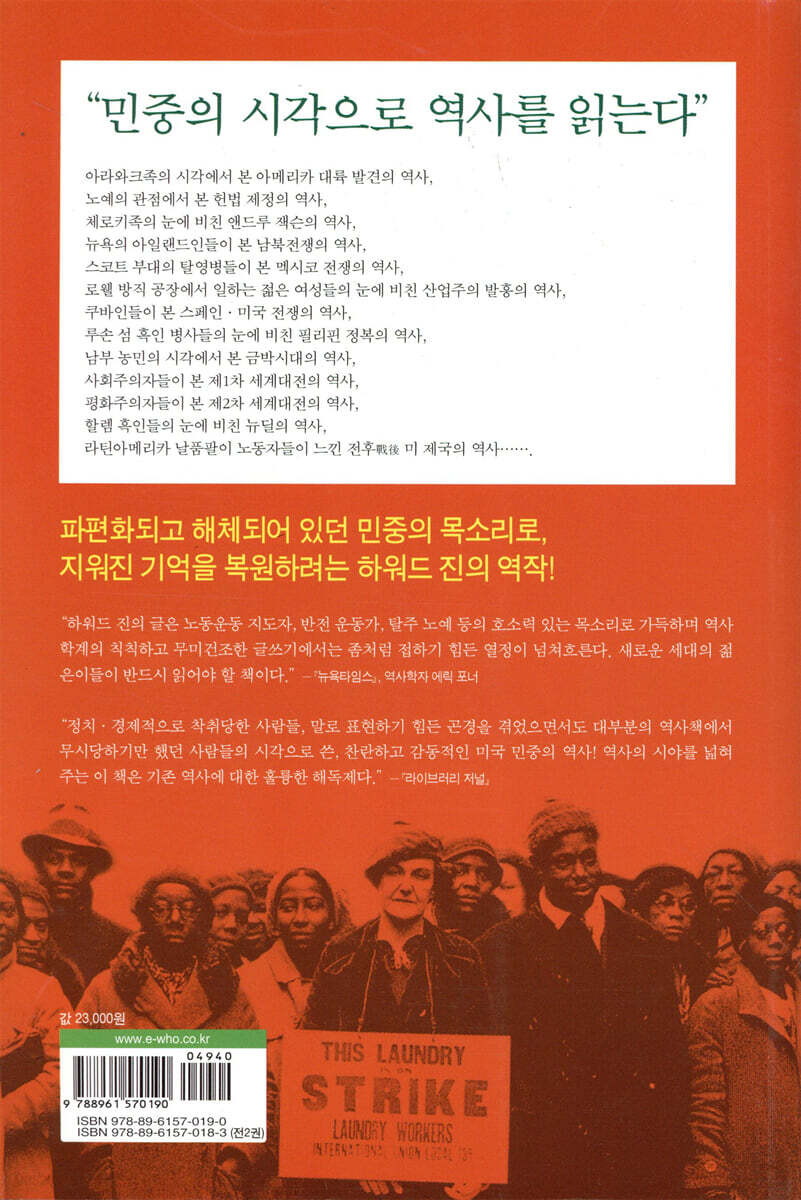 “하워드 진은 정치·경제적으로 착취당한 사람들, 말로 표현하기 힘든 곤경을 겪었으면서도 대부분의 역사책에서 무시당하기만 했던 사람들의 시각으로 찬란하고 감동적인 미국 민중의 역사를 써냈다. 역사의 시야를 넓혀주는 이 책은 기존의 역사에 대한 훌륭한 해독제다. 『미국민중사』는 인용문이 특히 뛰어난데 흑인, 여성, 인디언, 온갖 나라에서 온 가난한 노동자들의 이야기를 모두 자신들만의 언어로 말해주는 예는 좀처럼 찾아보기 힘들다. 전문가들을 만족시킬 만큼 정확하면서도 모든 독자에게 역사책을 읽는 기쁨을 준다.”