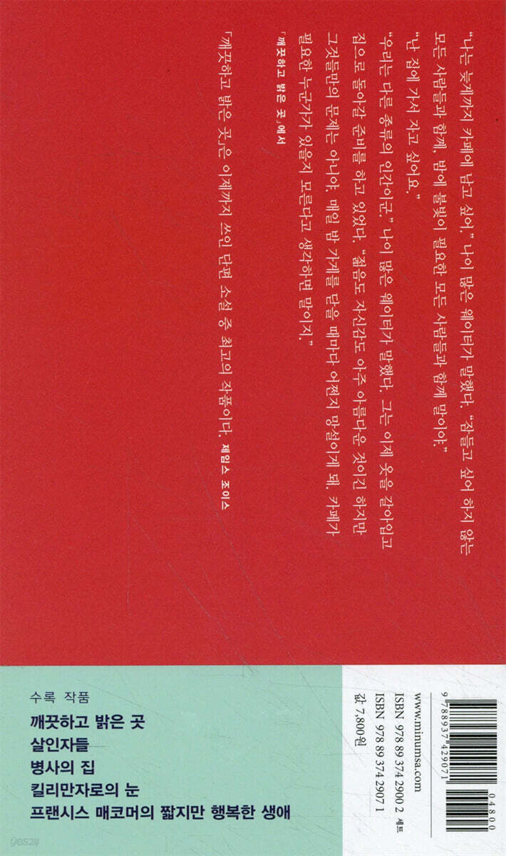 마감시간까지 브랜디를 마시며 앉아있는 노인을 바라보며 젊은 웨이터와 나이든 웨이터는 대화를 나눕니다. 젊은 웨이터는 마감시간이 임박함에도 바의 종업원을 배려하지 않는 노인에게 싫은 내색을 하죠. 한편 나이든 웨이터는 노인의 심정을 이해해요. 그 나이엔 모든 것이 허무할 뿐이라고요. 단지 그(노인)에게 밝을 뿐 아니라 깨끗하기도 한 곳이 필요할 거라고요. 나이든 웨이터도 자신의 바를 정리하고, 다른 바에 들어가 젊은 바텐더의 술을 받아 마십니다. 그리고 자신이 술을 마시는 그 바는 밝지만 깨끗하지 않다고 읊조리죠.