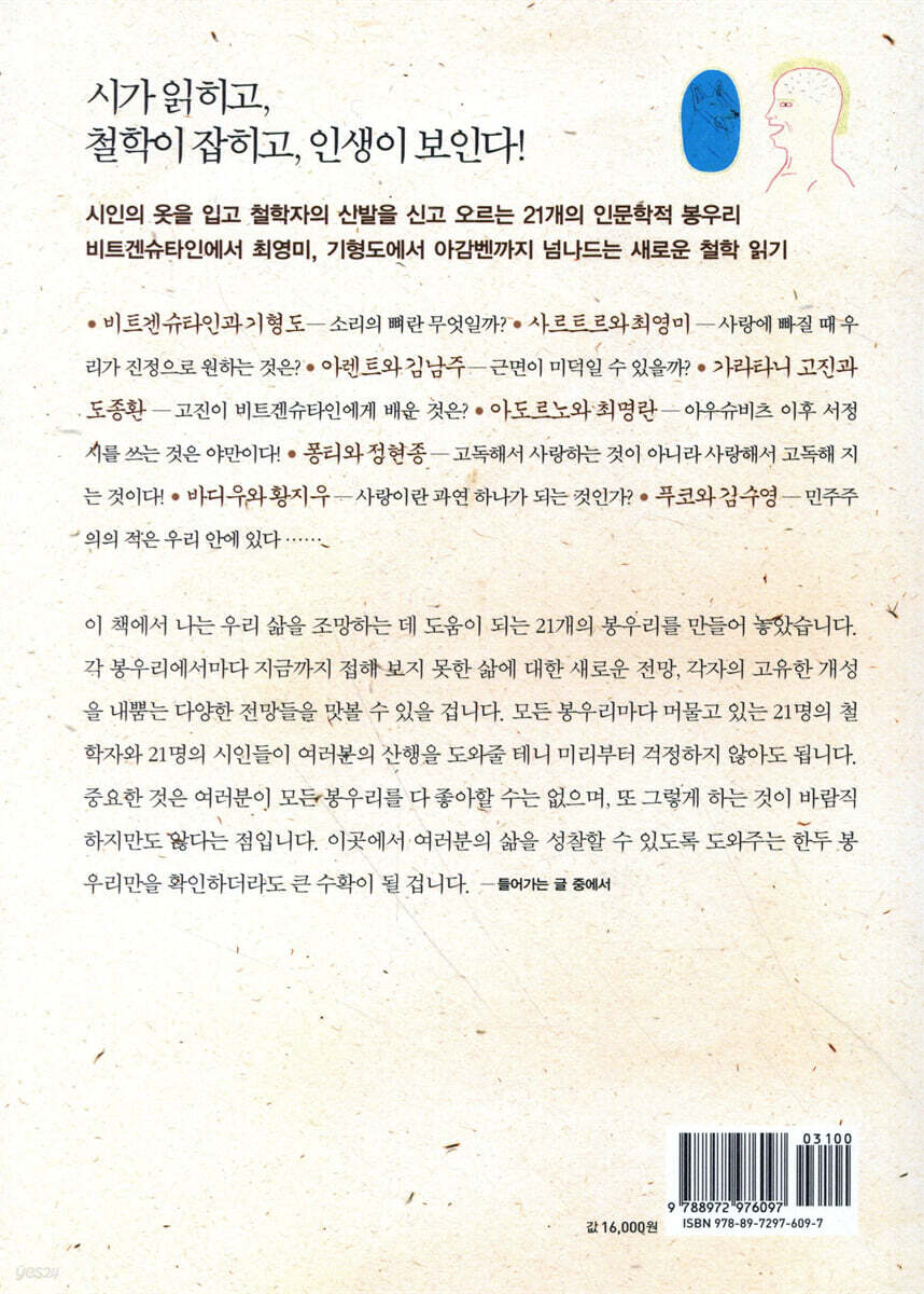 저자는 우리 시대를 대표할 만한 주제 21가지를 선정하고 그에 걸 맞는 21명의 시인과 사회 사상가를 연결하며 각각의 주제를 친절한 안내를 하고 있다. 김수영, 김춘수, 황동규, 황지우, 기형도, 최영미 등 우리에게 친숙한 시인과 다소 거리감이 있는 들뢰즈, 푸코, 사르트르, 아도르노, 데리다, 푸코, 하이데거, 하버마스 등 현대 사회사상가의 만남이다. 접근하기 쉽지 않은 사회사상가의 중심 사상을 시인의 시를 통해 찾아가는 형식이라 거부감 없이 접근하고 매료될 수 있게 한다.