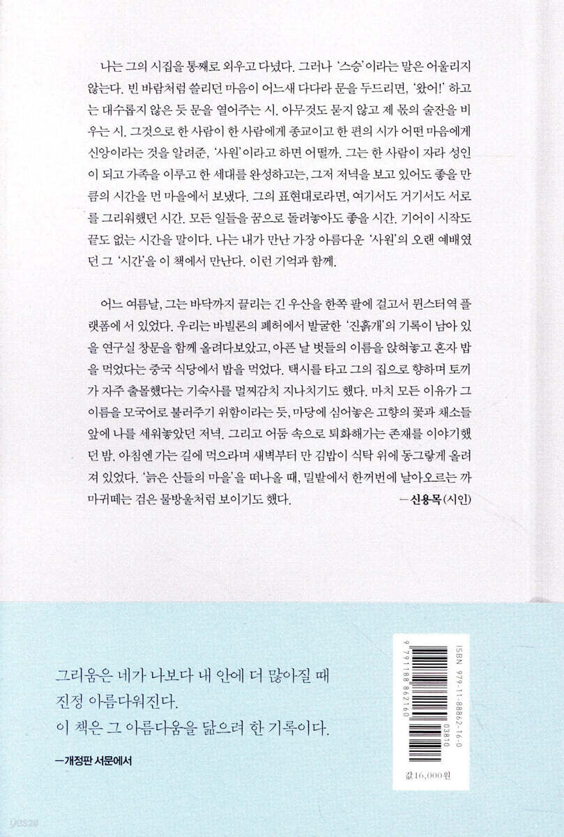 그때, 나는 묻는다. 왜 너는 나에게 그렇게 차가웠는가. 그러면 너는 나에게 물을 것이다. 그때, 왜 나에게 그렇게 뜨거웠는가. 서로 차갑거나 뜨겁거나, 그때 서로 어긋나거나 만나거나 안거나 뒹굴거나 그럴 때, 서로의 가슴이 이를테면 사슴처럼 저 너른 우주의 밭을 돌아 서로에게로 갈 때, 차갑거나 뜨겁거나 그럴 때, 미워하거나 사랑하거나 그럴 때, 나는 내가 태어나서 어떤 시간을 느낄 수 있었던 것만이 고맙다. -고마웠다, 그 생애의 어떤 시간 (p131) |