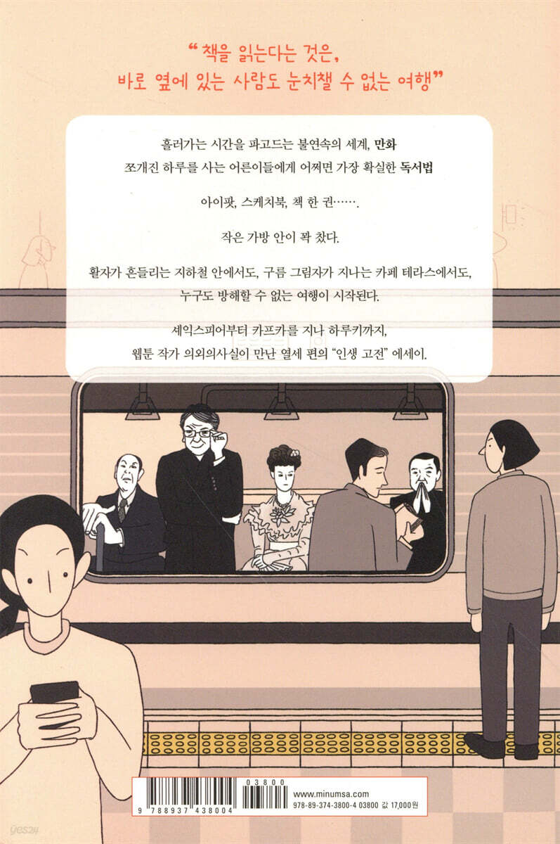 지금은 하루키, 베르베르 말고는 문학을 별로 찾아 읽지 않지만, 고등학교, 대학교 때는 소설을 닥치는 대로 읽었다. 서양 고전보다는 현대 한국 작가 소설을 좀 더 많이 읽었지만. 특유 표지로 이미지를 각인 시킨 세계문학 시리즈로 유명한 민음사가 똑똑했다. 바로 그 세계문학 시리즈를 그림 그리는 이에게 들려주어 읽게 하고 웹툰으로 그려달라고 요청했다. 남이 책 읽은 이야기 잘 구입하지 않는데도 구입을 결심할 수 있었던 이유는 작가 목록에 하루키가 있었기 때문이었다. 전반적으로 고전 문학을 깊이 읽고(웹툰을 그리기 위해 여러 번 읽었다고 함), 남들이 천편일률적으로 읽는 방식이 아니라 닉네임 대로 의외의 참신한 시각으로 읽어내어 특별한 맛이 있었다. 예스이십사 채널예스 책읽아웃 김하나와의 인터뷰를 보니 과연, 국어교육 전공자라고 한다(이 지점에서 나도 의외의사실 작가처럼 대학교 4학년 때 임고 준비를 시작하지 않고 다른 방향으로 틀었다면 지금 내 인생은 어떤 모습일까 궁금해졌다). 작가 나잇대가 궁금해서 검색하다가 처음 이 기사를 보았을 때 얼굴이 나왔는데, 지금은 자신의 캐릭터와 마루 그림으로 가려두었네. http://ch.yes24.com/Article/View/36931