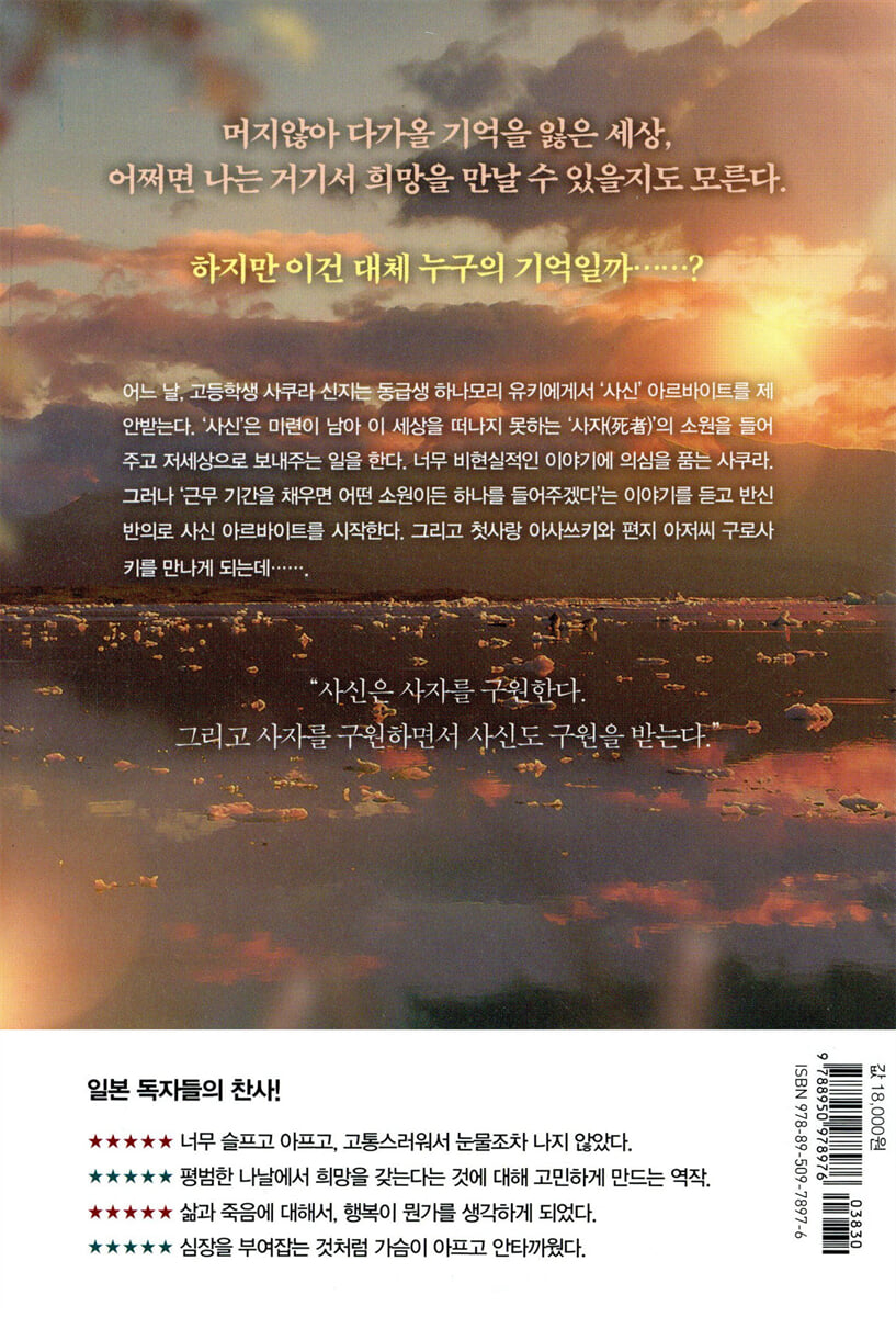 즉시 채용, 선지급이라는 말에 혹해서 시작한 아르바이트였기에 반신반의하는 맘으로 장난스럽게 시작했지만 사자를 위해 동분서주하며 그들을 인도하는 역할을 했던 사쿠라는 자신의 삶을 똑바로 보게 된다. "사신은 사자를 구원한다. 그리고 사자를 구원하면서 사신도 구원을 받는다." 라는 말의 의미가 분명해졌다. 사쿠라도 사신으로서의 마지막 역할을 하면서 많은 것을 깨닫게 되었다.
