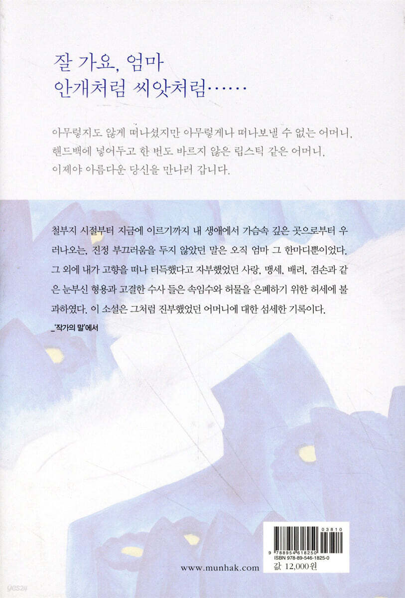 '한평생 무겁고 가혹한 삶의 중턱에서 벗어날 날 없었던 어머니는 결국 한줌의 먼지였다. 라는 표지의 한줄 글에서