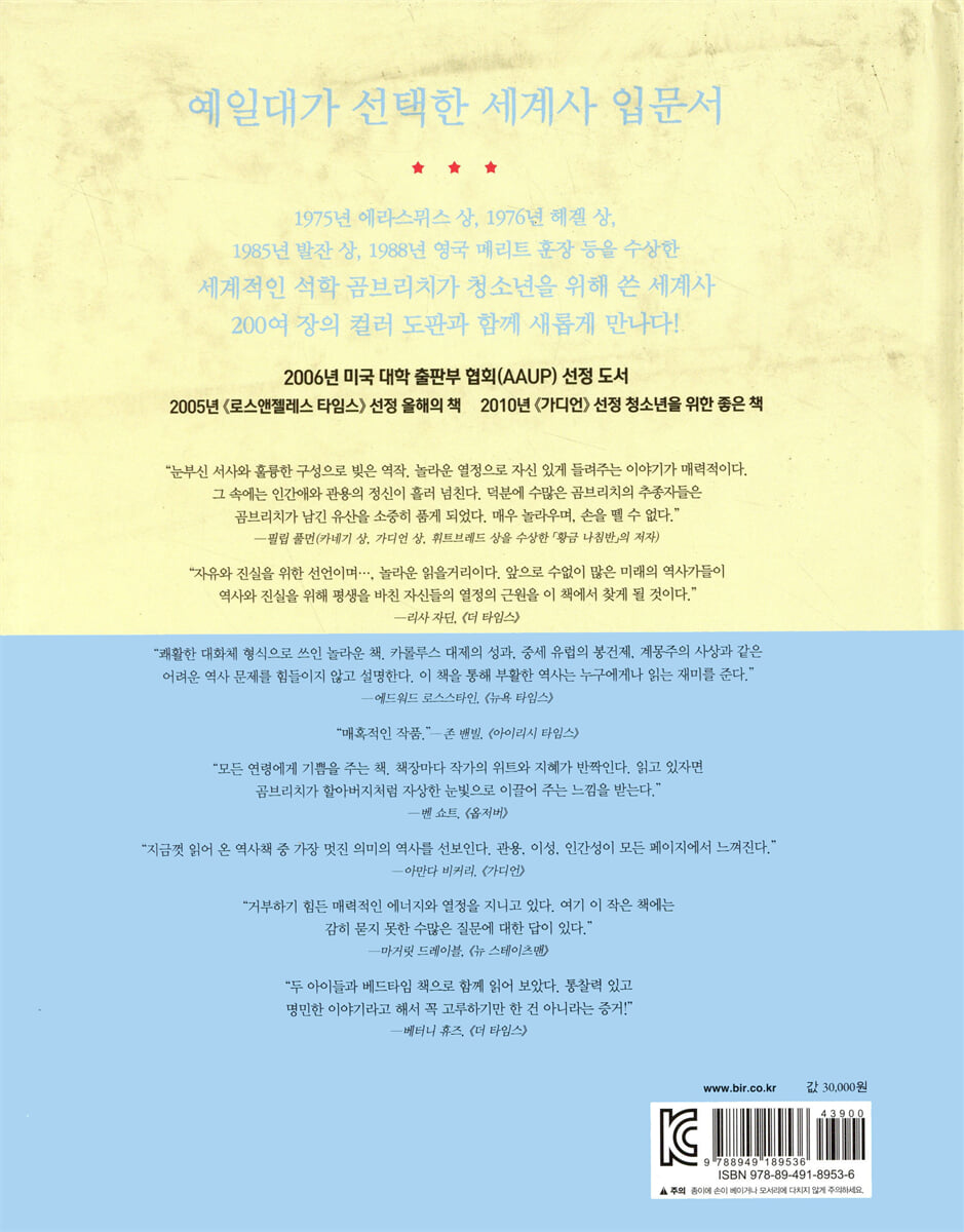 이 책을 읽으면서 감탄한 것은 방대한 세계사의 역사를 이처럼 한눈에 들어오도록 설명할 수 있는 저자의 놀라운 통찰력이다. 어느 한 부분의 역사를 세밀하게 저술하는 것도 뛰어난 역사가이지만, 몇 천 년의 방대한 역사를 하나의 강물의 흐름으로 이야기하듯 이렇게 바라보고 묘사할 수 있다는 것이 저자가 얼마나 역사에 대해 깊이 있는 지식과 시각을 가졌는지를 알게 한다. 역사를 어렵게 생각하는 사람도 이 책을 읽으며 곰브리치의 시각을 따라 하나하나 바라보면 역사의 흐름을 어느 정도 느낄 수 있을 거라 생각된다.