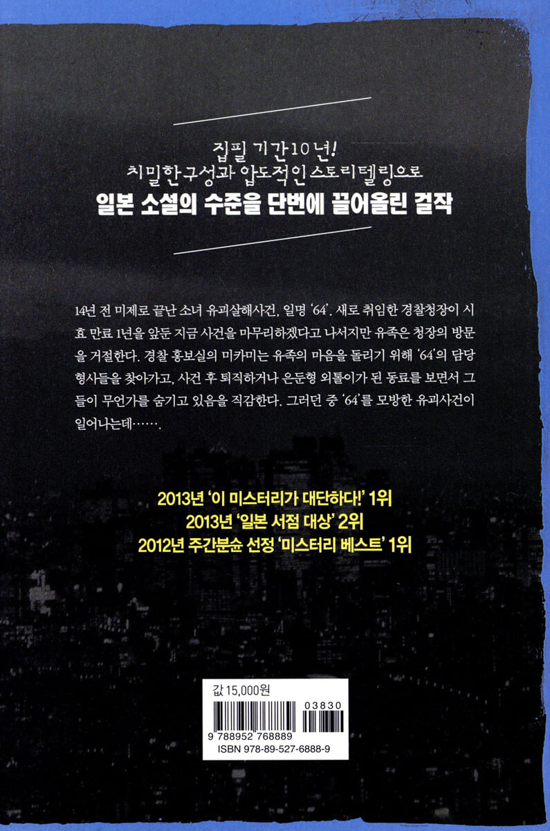 이 소설에 대한 상찬은 10포인트 글자로 A4 2장 분량으로 떠들어도 얼마든지 할 수 있을 터이지만 그건 사실 쓸데없는 말에 불과하다. 백문이 불여일견이라고 일단 이 책을 읽기만 해도 얼마든지 스스로 깨달을 수 있는 장점이기 때문이다. 그러므로 이 책이 가진 장점을 말하기 보다는 요코야마 히데오는 왜 '64'를 이렇게 만들었나를 말하는 게 더 나을 것 같다.