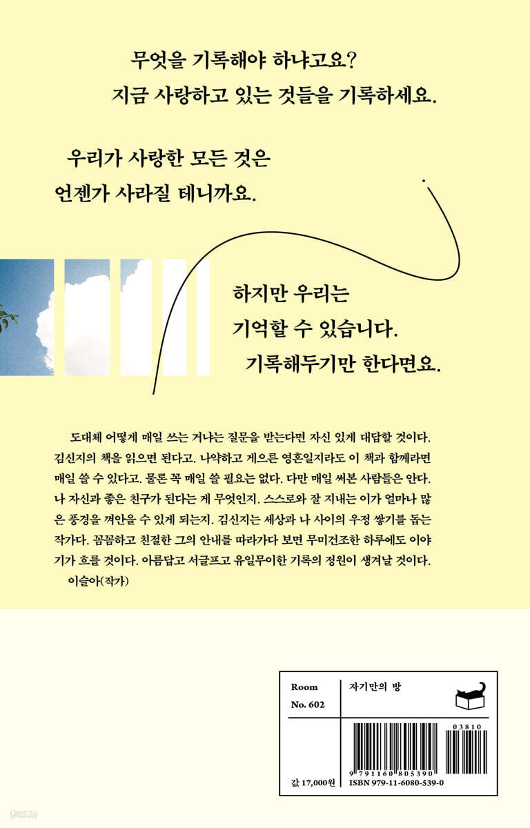 기록은 나에게 있어 중요한 것이 무엇인지 잊지 않게 해주고, 삶이 건네는 사소한 기쁨들을 알아챌 수 있도록 돕는다는 사실 말이에요(11쪽).